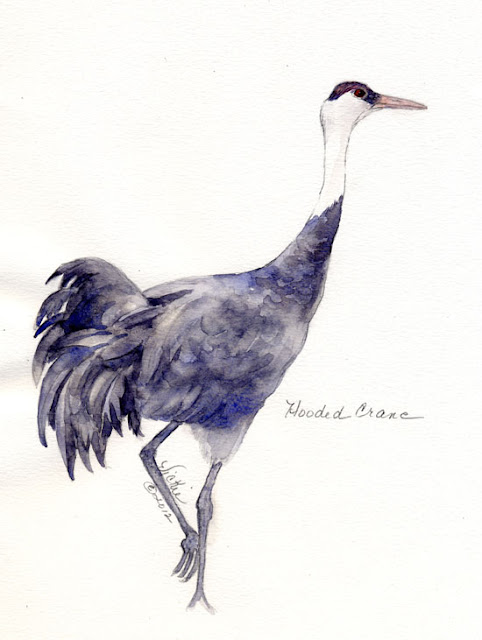 I saw this crane at the Hiwassee Wildlife Refuge during our TN Sandhill Crane Festival.  As I was researching this endangered species, I remembered that I first saw a hooded crane at the International Crane Foundation in Baraboo, Wisconsin, in 2005.  I remembered that this small crane, only 3.3 ft. tall compared to our 4-5 ft. sandhill cranes in the east, became excited and leaped into the air while I was viewing her. In the sketch, she has just landed and is holding her tertiary wing feathers fluffed up into a bustle over her tail.