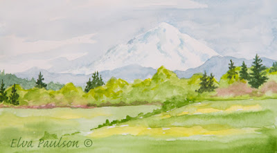 This isn't quite a 'field sketch' since it was painted in the car while my husband was driving. Oregon's spring was just bursting with every shade of green and off in the distance loomed the pristine snow on Mt. Hood. The interstate was reasonable smooth so I could paint on my lap.